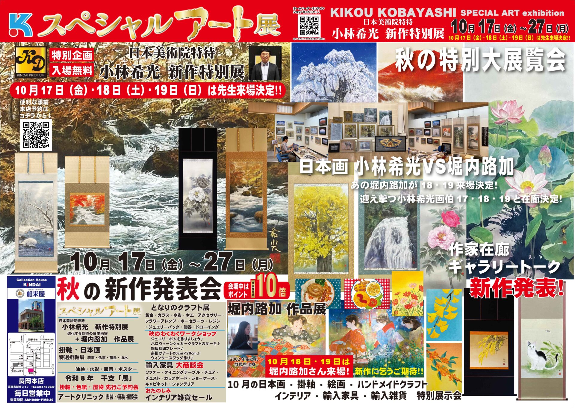 特別展は、日本美術院特待の小林希光先生と若手日本画家の堀内路加さんの特別大展覧会です。小林希光先生は17日・18日・19日の3日間、堀内路加さんは18日・19日の2日間在廊します!