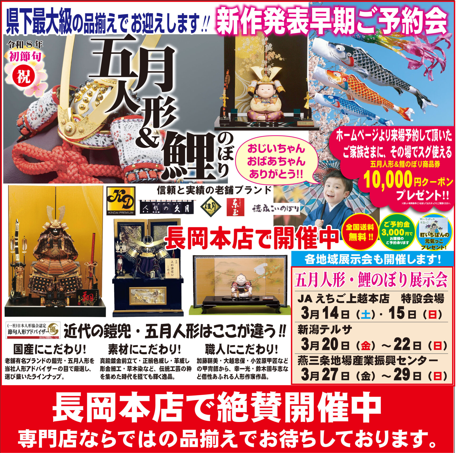 来店のご予約いただいたご家族様には必ず、合計10万円以上のお買物で、もらってスグに使える10,000円分の五月人形クーポンをプレゼント!(※来店時にご予約者様のお名前をスタッフにお知らせください。先着にかかわらずクーポンをご用意しております。)